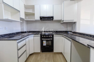Cocina con amoblamiento bajo mesada y alacenas de melamina con aplicaciones de aluminio anodizado, mesada de granito, pileta de acero inoxidable, grifería FV monocomando